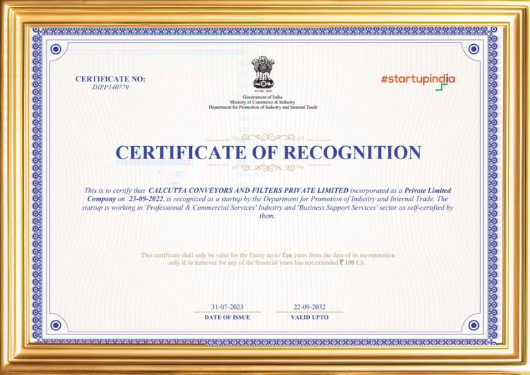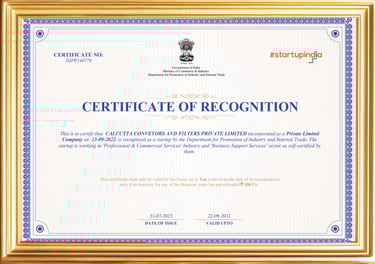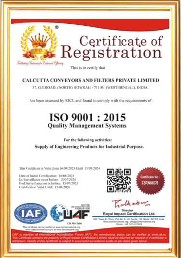 Calcutta Conveyors and Filters Pvt. Ltd. is committed to adhering to the highest industry standards. Our dedication to quality and safety is reflected in the certifications we have earned. These accreditations underscore our dedication to quality, safety, and environmental responsibility.